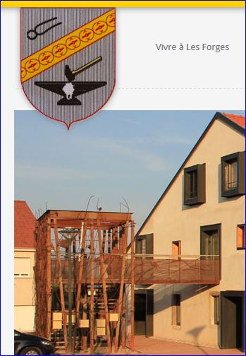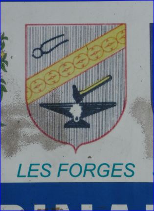 D'or à la flamme de gueules mise en barre mouvant du flanc dextre accompagnée en chef d'une tenaille renversée de sable posée en barre et en pointe d'une enclume surmontée d'un marteau du même posé en barre.