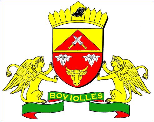 (2014) Coupé: au 1er d'or au triangle de gueules chargé de deux poignards romains [pugios] d'argent, garnis d'or, hauts, passés en sautoir, au 2e de gueules aux 2 fleurs de lis des jardins au naturel soutenues d'un rencontre de boeuf d'or.