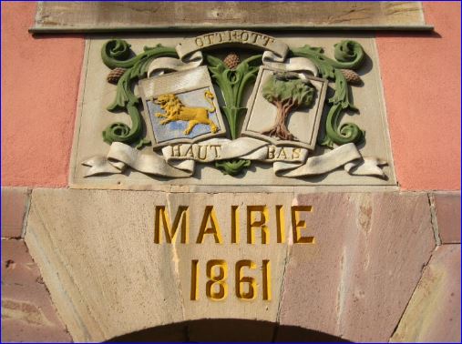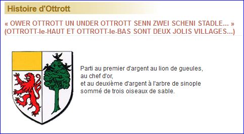 Parti: au 1er d'argent au lion de gueules et au chef d'or, au 2e d'argent à l'arbre arraché de sinople sommé de trois corbeaux essorants de sable.