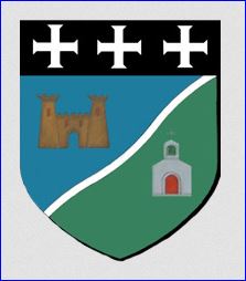 (1966) Taillé ondé: au 1er d'azur au château flanqué de deux tours d'or, ouvert du champ, maçonné de sable, au 2e de sinople au portail d'église d'argent maçonné de sable, la porte de gueules, à la cotice en barre ondée d'argent brochant sur la partition; le tout sommé d'un chef de sable chargé de trois croisettes pattées d'argent.