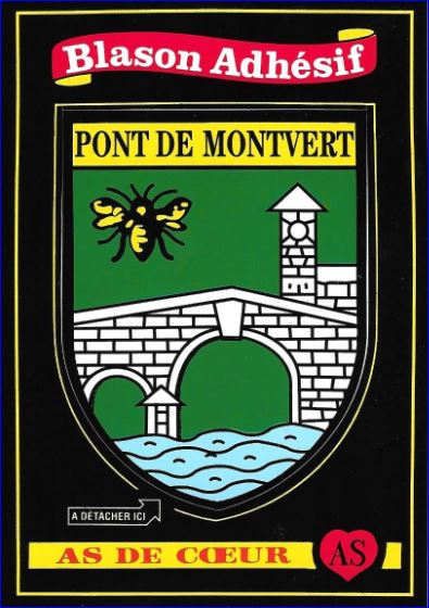 (1950) De sinople au pont en dos d'âne de deux arches inégales d'argent, flanqué à senestre d'une tour couverte du même, maçonnée de sable, ajourée du champ, posé sur des ondes d'argent mouvant de la pointe, la tour adextrée d'une abeille en vol d'or.