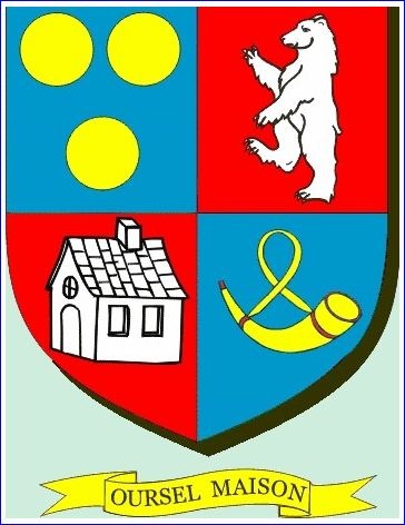Écartelé: au 1er d'azur à trois besants d'or, au 2e de gueules à l'ours rampant d'argent, au 3e de gueules à la maison d'argent au 4e d'azur au huchet d'or, le pavillon à senestre.