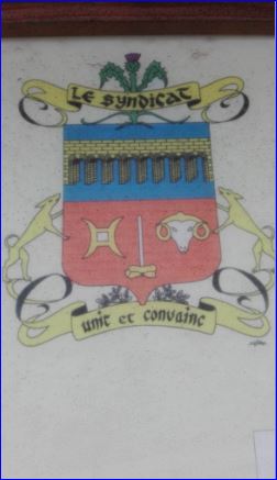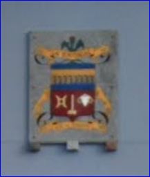 Coupé: au 1er d'azur à l'aqueduc de huit arches d'or maçonné de sable, au 2e de gueules à la massette à escarloper [de carrier] d'or emmanchée d'argent posée en pal la tête en bas, flanquée à dextre d'un fer de moline d'or et à senestre d'un rencontre de bélier d'argent accorné d'or.