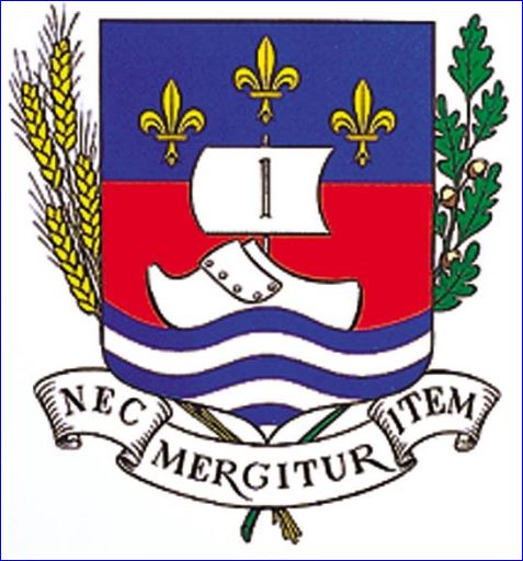 ((1993) De gueules au sabot d'argent voguant sur une mer fascée ondée d'azur et d'argent de six pièces; au chef d'azur chargé de trois fleurs de lis mal ordonnées d'or, le dit sabot mâté et voilé d'argent brochant sur le chef.
