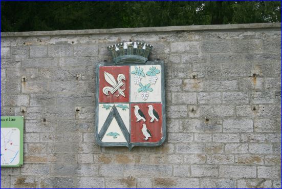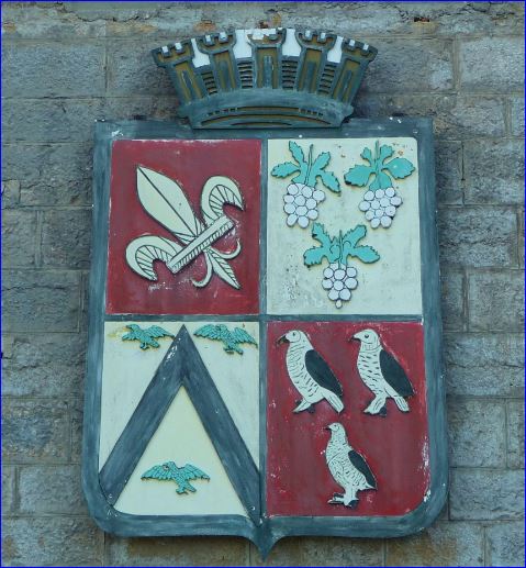 Écartelé: au 1er de gueules à la fleur de lis d'or posée en bande, au 2e d'or à trois grappes de raisin d'argent tigées et feuillées de sinople, au 3e d'or au chevron de sable accompagné de trois oiseaux en vol de sinople, au 4e de gueules à trois faucons d'or.