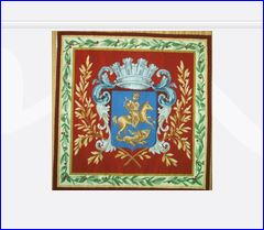 D'azur à saint Georges monté sur un cheval terrassant un dragon couché, le tout d'or.