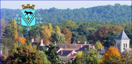 D'azur au chevron renversé d'or vidé du champ en forme d'échelle accompagné en coeur d'une fleur de lis d'or surmontée d'un loup passant de sable.