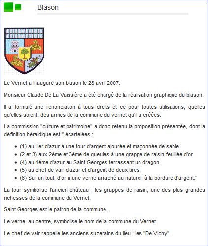 (2007) Écartelé: au 1er d'azur à la tour d'argent, ouverte, ajourée et maçonnée de sable, aux 2e et 3e de gueules à la grappe de raisin, tigée et feuillée d'or posée en barre dans le 2e et en bande dans le 3e, au 4e d'azur à saint Georges d'or, sur son cheval de gueules, terrassant de sa lance de sable un dragon de sinople langué de gueules; sur le tout, d'or au vergne au naturel et à la filière d'argent; le tout sommé d'un chef vairé en pal d'azur et d'argent de deux tires.