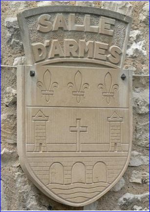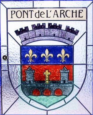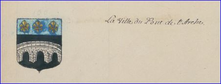 De gueules au pont de trois arches d'argent maçonné de sable, mouvant d'une mer de sinople, sommé d'une croix latine d'or accostée de deux tours d'argent, maçonnées de sable; au chef cousu d'azur chargé de trois fleurs de lis d'or.