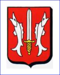 De gueules à l'épée d'argent garnie d'or, accostée de deux saumons adossés d'argent.