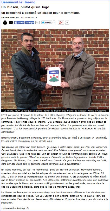 (2014) D'argent au mont de sinople surmonté de trois tourteaux de gueules mal ordonnés; au chef d'azur chargé d'un hareng d'argent.