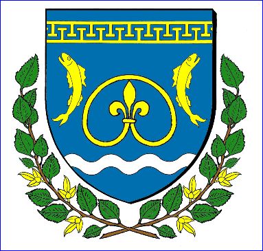 (2014) D'azur à la fleur des marais d'or, accostée de deux bars adossés, surmontée d'une jumelle potencée et contre potencée, le tout du même et soutenu d'une trangle ondée d'argent.