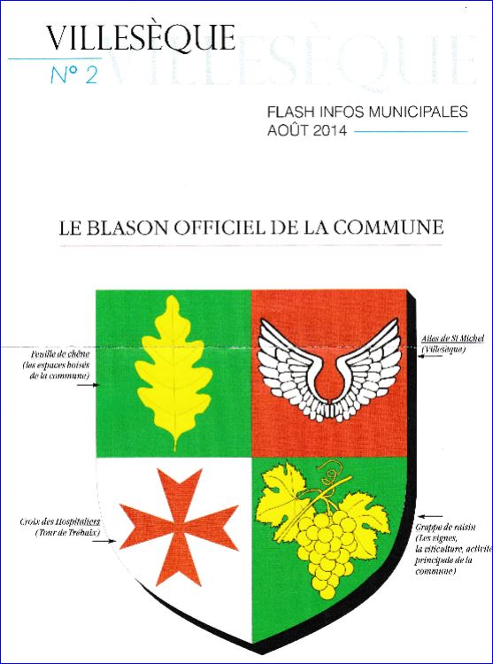 (2014) Écartelé: au 1er d'azur à la feuille de chêne d'or, au 2e de gueules au vol d'argent, au 3e d'argent à la croix de Malte de gueules, au 4e de sinople à la grappe de raisin pamprée d'or.