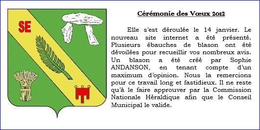(2012) De sinople à la bande d'or chargée, en chef, des lettres « SE » de gueules, en coeur, d'une palme du champ et, en pointe, d'un gonfanon de gueules frangé de sinople, ladite bande accompagnée, en chef, d'un dolmen d'argent et, en pointe, d'une gerbe de blé d'or.
