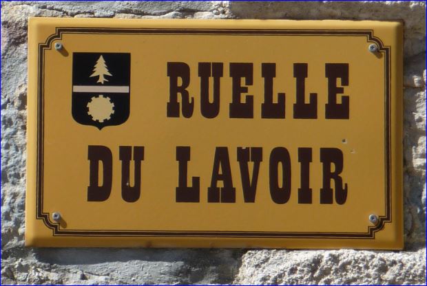 (1956) De sable à la divise d'argent accompagnée en chef d'un sapin d'or et en pointe d'une roue dentée du même.