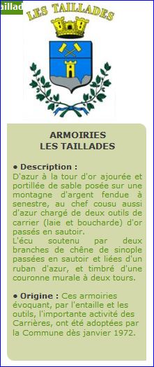 (1972) D'azur à la tour d'or, ajourée et ouverte de sable, posée sur une terrasse d'argent fendue à senestre; au chef cousu d'azur chargé de deux outils de carrier [laie et boucharde] d'or passés en sautoir.