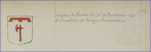 Ce sont ici les armes de Jacques de Bernes, écuyer, seigneur de Baudretun, capitaine de cavalerie des troupes boulonnaises. C'est bien une hache d'armes, et non une doloire, qui a été enregistrée par les commis de Charles d'Hozier, juge d'armes et généalogiste du roi.
