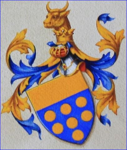 (1978) Parti: au 1er d'azur à sept besants d'argent (d'or) ordonnés 3, 3 et 1 et au chef du même, au 2e mi-parti d'or à l'aigle bicéphale de sable.