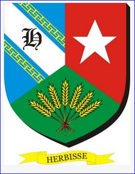 (2014) Tiercé en pairle renversé: au 1er d'azur à la bande d'argent chargée de la lettre gothique H de sable et côtoyée de deux jumelles potencées imbriquées intérieurement d'or, au 2e de gueules à l'étoile d'argent, au 3e de sinople à sept épis de blés d'or posés en éventail liés de gueules.