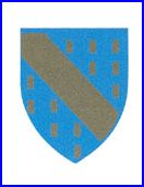 D'azur à la bande d'or accompagnée de douze billettes du même, six en chef ordonnées, 3, 2 et 1, six en pointe rangées en bande, 3 et 3.