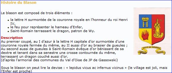 Parti: 1er coupé au I d'azur à la lettre capitale H d'or surmontée d'une couronne royale fermée du même, au II d'or au brasier de gueules, au 2e de gueules à saint Romain évêque d'or bénissant de sa dextre et tenant dans sa senestre une crosse contournée du même, terrassant un dragon couché, contourné et renversé d'or.