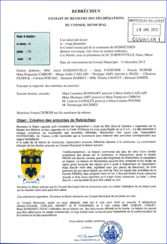 Extrait du Registre des Délibérations du 20 décembre 2012.