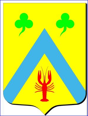 D'or au chevron d'azur accompagné, en chef, de deux trèfles de sinople et, en pointe, d'une écrevisse de gueules posée en pal.