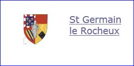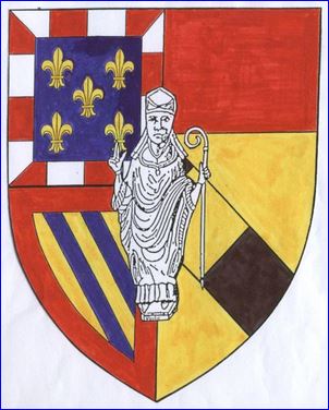 Parti: au 1er coupé au I d'azur semé de fleurs de lis d'or à la bordure de componée d'argent et de gueules, au II bandé d'or et d'azur à la bordure de gueules, au 2e d'or au chef de gueules, à la bande componée de sable et d'or de trois pièces; à saint Germain évêque la main dextre bénissant et la senestre tenant sa crosse, le tout d'argent et brochant sur le parti.