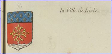 De gueules à la croix cléchée, vidée et pommetée de douze pièces d'or, soutenue d'une rivière d'argent; au chef d'azur chargé de trois fleurs de lis d'or.