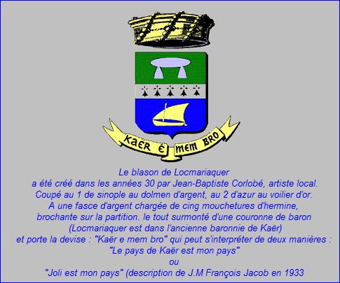 Coupé: au 1er de sinople au dolmen d'argent, au 2e d'azur au voilier d'or; à la fasce d'argent chargée de cinq mouchetures d'hermine de sable.