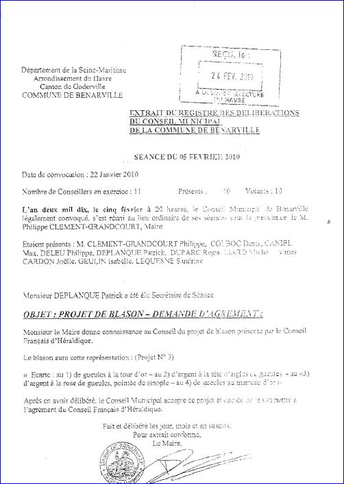 (2010) Écartelé: au 1er de gueules à la tour d'or, maçonnée de sable, ouverte et ajourée du champ, au 2e d'argent à la tête d'aigle de gueules, au 3e d'argent à la rose de gueules pointée de sinople, au 4e de gueules au marteau d'or.