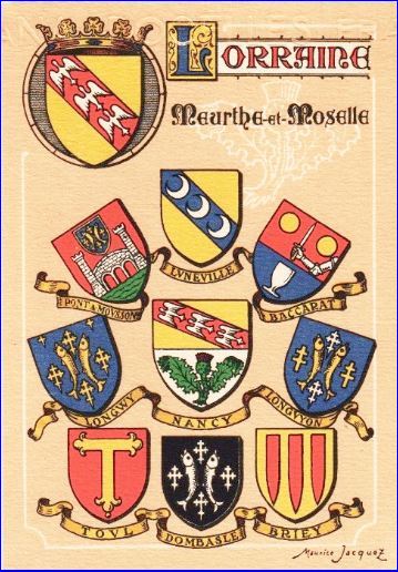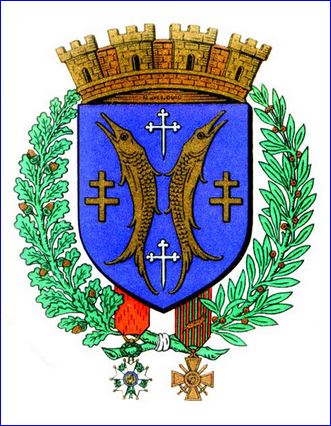 D'azur à deux bars adossés d'or, accostés de deux croix de Lorraine de même et accompagnés en chef et en pointe de deux croisettes tréflées au pied fiché d'argent.