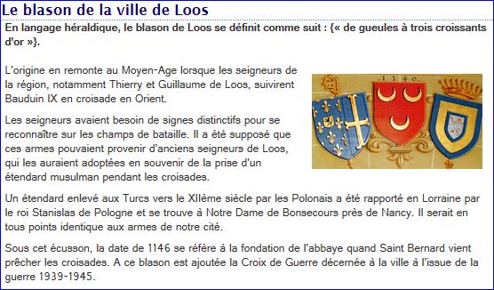 Parmi les chevaliers de la maison de Loos, Thierry et Guillaume de Loos prirent part en 1200 à la croisade du comte de Flandre Baudouin IX. Une tradition orale, qui n'a de valeur qu'en tant que légende héraldique, prétend que chacun des croissants correspond à une bataille à laquelle ils prirent part.