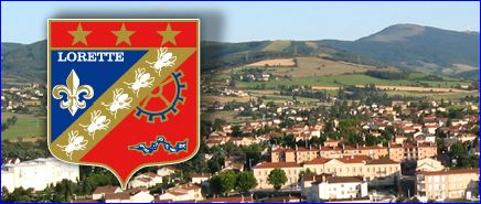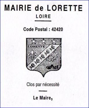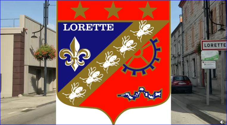 Taillé: au 1er d'azur à la fleur de lis d'or surmontée de l'inscription LORETTE en lettres capitales de sable, au 2e de gueules à la roue d'engrenage d'argent surmontant un arbre à cames de même posé en fasce; à la barre d'or chargée de six abeilles d'argent, posées dans le sens de la barre, la tête vers la pointe, brochant sur le taillé; le tout sommé d'un comble cousu de gueules chargé de trois étoiles d'or.