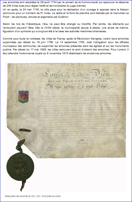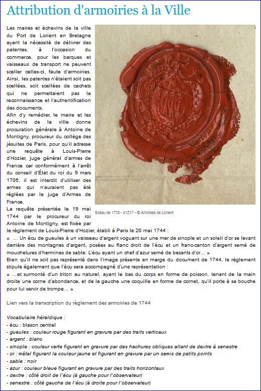 (1744) De gueules au vaisseau d'argent voguant sur une mer de sinople, au soleil rayonnant d'or, se levant derrière des montagnes d'argent, posées au flanc dextre de l'écu; au franc-canton d'hermine; le tout sommé d'un chef d'azur semé de besants d'or.