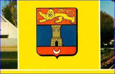 D'or à la tour de sable ouverte et maçonnée d'argent posée sur une champagne d'azur chargée d'un croissant d'or; au chef de gueules chargé d'un léopard d'or.