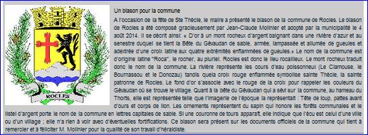 (2014) D'or au mont rocheux d'argent mouvant des flancs et posé sur une rivière d'azur mouvant de la pointe, sommé à senestre de la Bête du Gévaudan, rampante, de sable, armée, lampassée et allumée de gueules et surmonté à dextre d'une croix latine aux quatre extrémités enflammées de gueules.