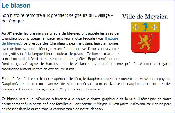 De gueules au lion d'or, armé et lampassé d'azur; au chef d'or chargé d'un dauphin d'azur, barbé, crêté, lorré, oreillé et peautré de gueules accosté de deux croix de Malte d'argent.