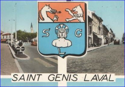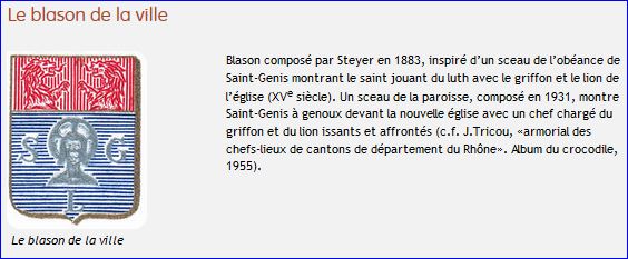 (1883) D'azur au buste de saint Genis d'argent nimbé d'or accompagné des lettres capitales du même S et G en chef, L en pointe; au chef cousu de gueules chargé d'un griffon d'or et d'un lion d'argent affrontés et issants.