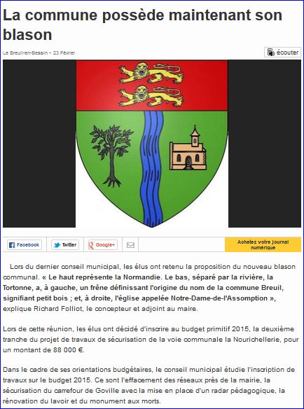 (2015) De sinople à la rivière ondée en pal d'argent agitée d'azur, accompagnée à dextre d'un frêne et à senestre de l'église du lieu le tout d'argent; au chef cousu de gueules chargé de deux léopards d'or, l'un sur l'autre, armés et lampassés d'azur.