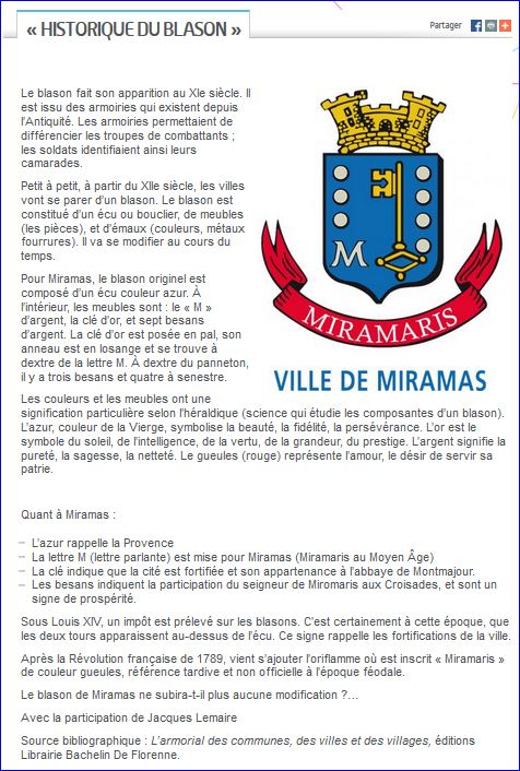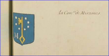 D'azur à la clef à l'anneau en losange d'or déportée à senestre, accostée de sept besants d'argent ordonnés en deux pals, trois à dextre et quatre à senestre, ceux de dextre soutenus d'une lettre capitale M du même.