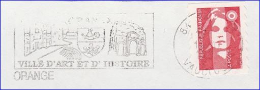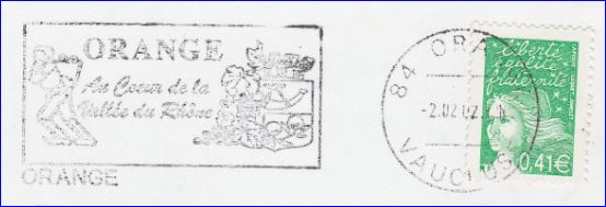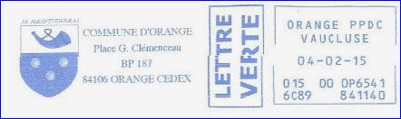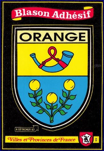 D'azur à la branche d'oranger feuillée de sinople, fruitée de trois oranges d'or; au chef d'or chargé d'un huchet d'azur embouché, enguiché, virolé et lié de gueules, le pavillon à senestre.