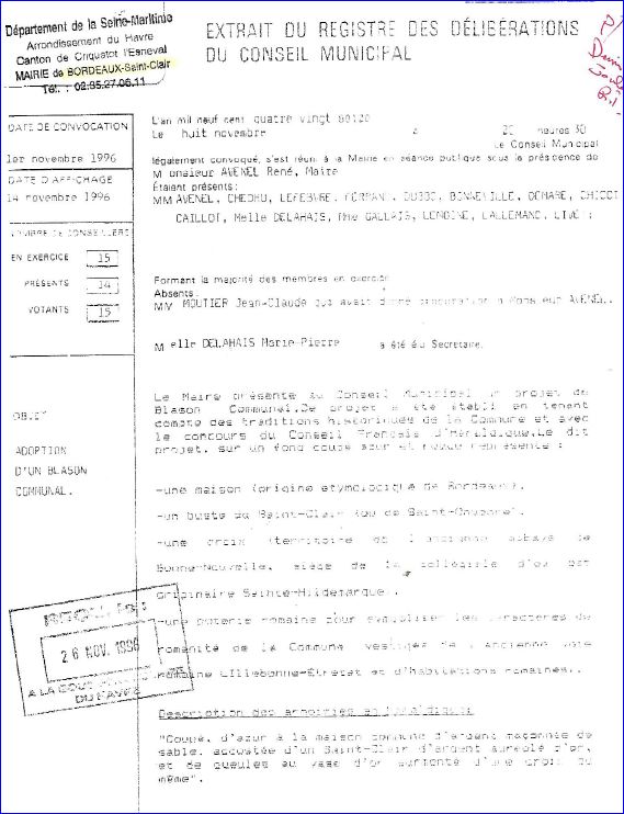 Extrait du registre des délibérations du 8 novembre 1996.