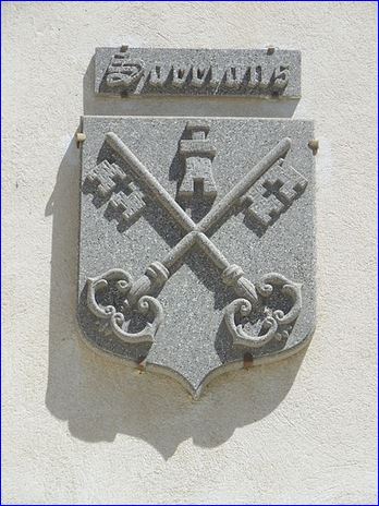 D'azur à la clef d'or et à la clef d'argent, passées en sautoir, accompagnées en chef d'une tour donjonnée et crénelée d'or, ouverte et ajourée du champ, maçonnée de sable.