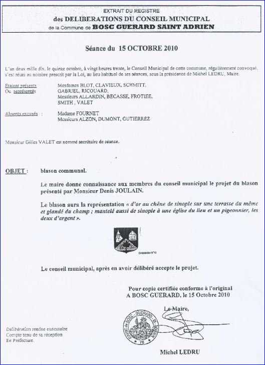 D'or au chêne de sinople sur une terrasse du même, englanté du champ; mantelé de sinople chargé à dextre d'une église du lieu d'argent et à senestre d'un colombier du même.