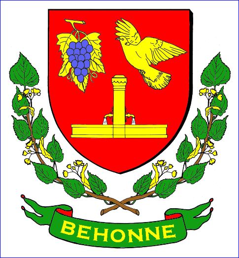 (2015) De gueules, chargé en chef, à dextre d'une grappe de raisin de pourpre pamprée et feuillée d'or, à senestre d'un pigeon essorant du même, soutenus d'une fontaine du même, à deux abreuvoirs et à la colonne centrale, crachant deux jets d'argent.