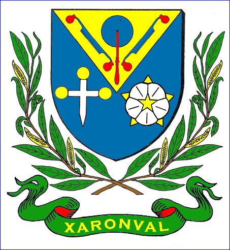 (2015) D'or à la roulette de charron accostée de deux planes adossées et posées l'une en bande, l'autre en barre, toutes trois d'azur emmanchées de gueules; mantelé renversé d'azur chargé à dextre d'une croisette d'argent au pied fiché et pommetée d'or, à senestre, d'une rose d'argent au bouton étoilé et aux pointes d'or.