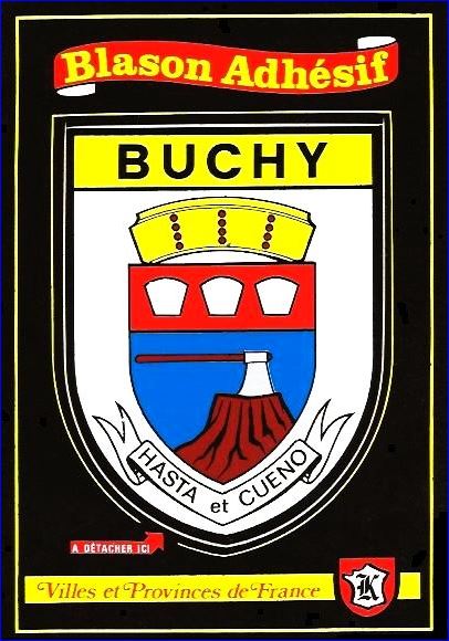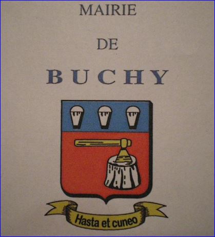De gueules à la hache d'or plantée en fasce dans une souche d'arbre d'argent; au chef cousu d'azur chargé de trois coins de bûcheron d'argent.