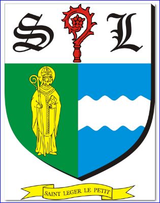 (2015) Parti: au 1er de sinople à saint Léger, évêque d'or, au 2e d'azur à la fasce ondée d'argent; le tout sommé d'un chef d'argent chargé d'une volute de crosse de gueules accostée à dextre de la lettre gothique S et à senestre de la lettre gothique L toutes deux de sable.