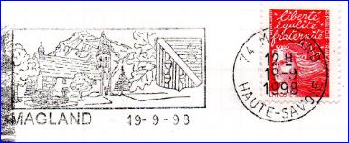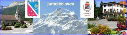 (1984) Tranché: au 1er d'azur au monogramme des colporteurs savoyards d'or, au 2e de gueules à trois glands d'or mal ordonnés; à la bande d'argent brochant sur la partition.